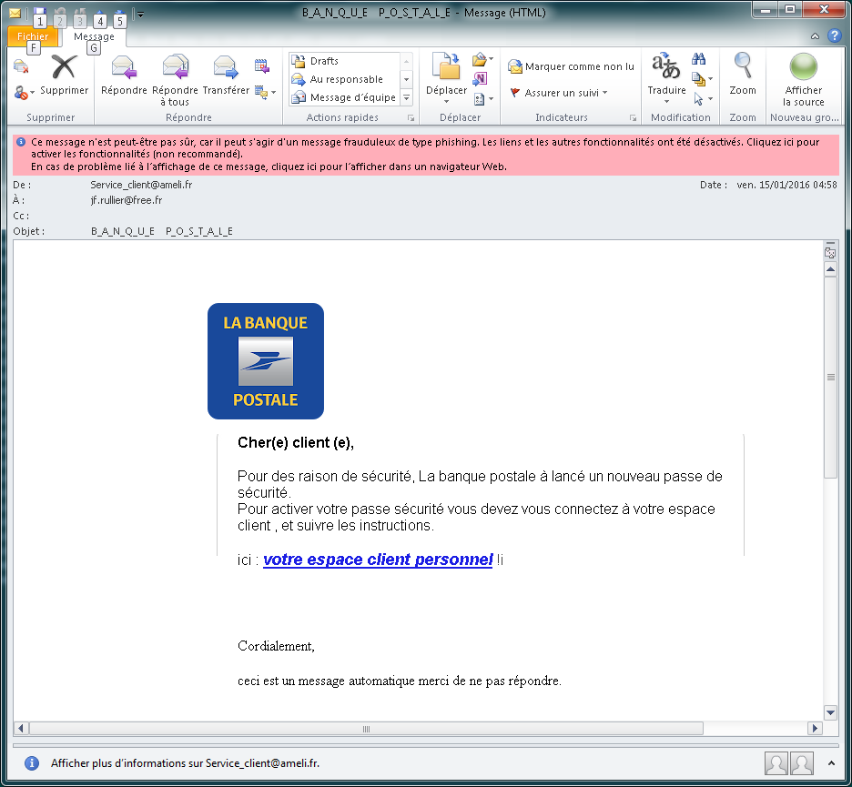 - L’adresse de l’expéditeur est « service_client@ameli.fr », or AMELI n’a rien à voir avec la Banque Postale.